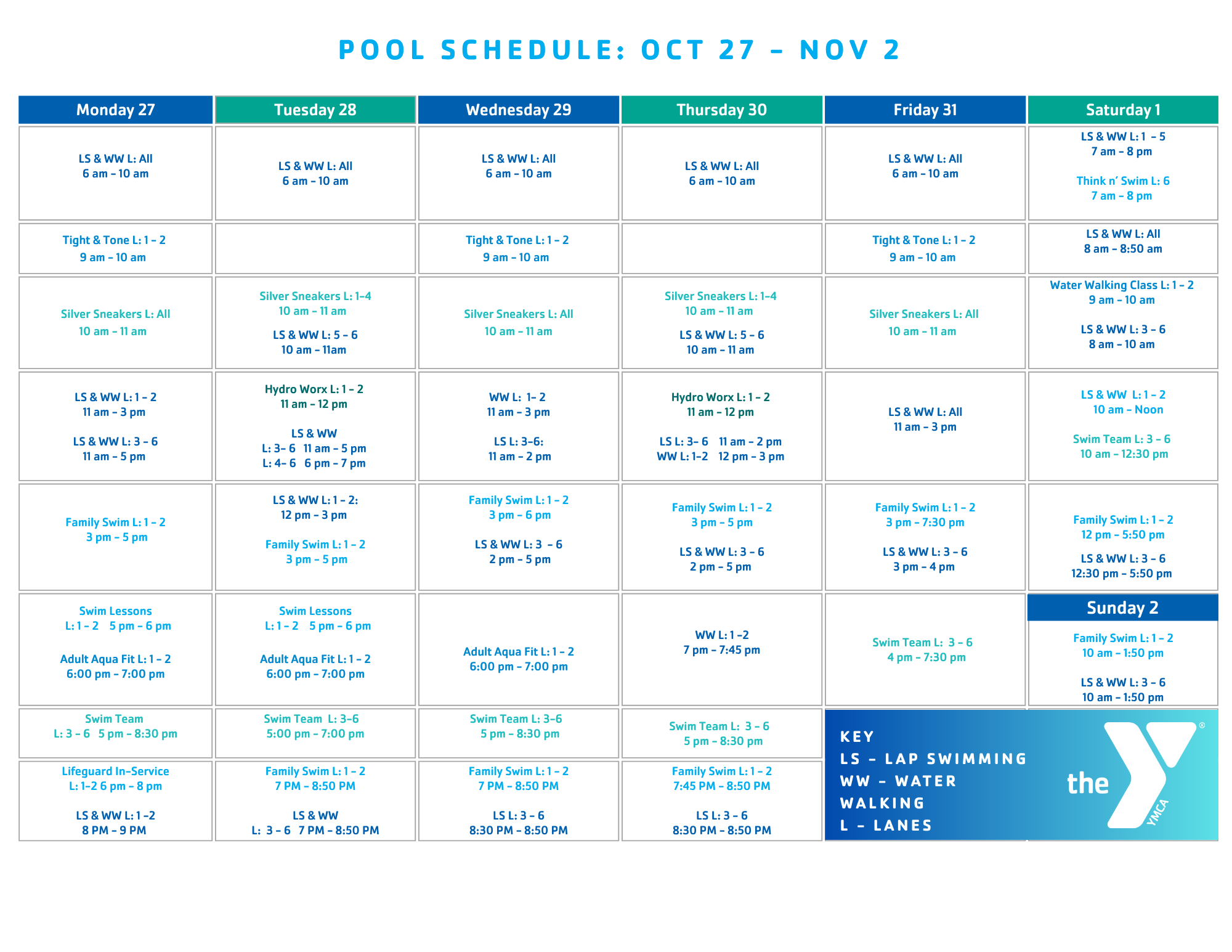 Pool Schedule The pool is closed for updates. Please check back in the afternoon of 10/29. Thank you. Printable Schedule Group Exercise Class Descriptions