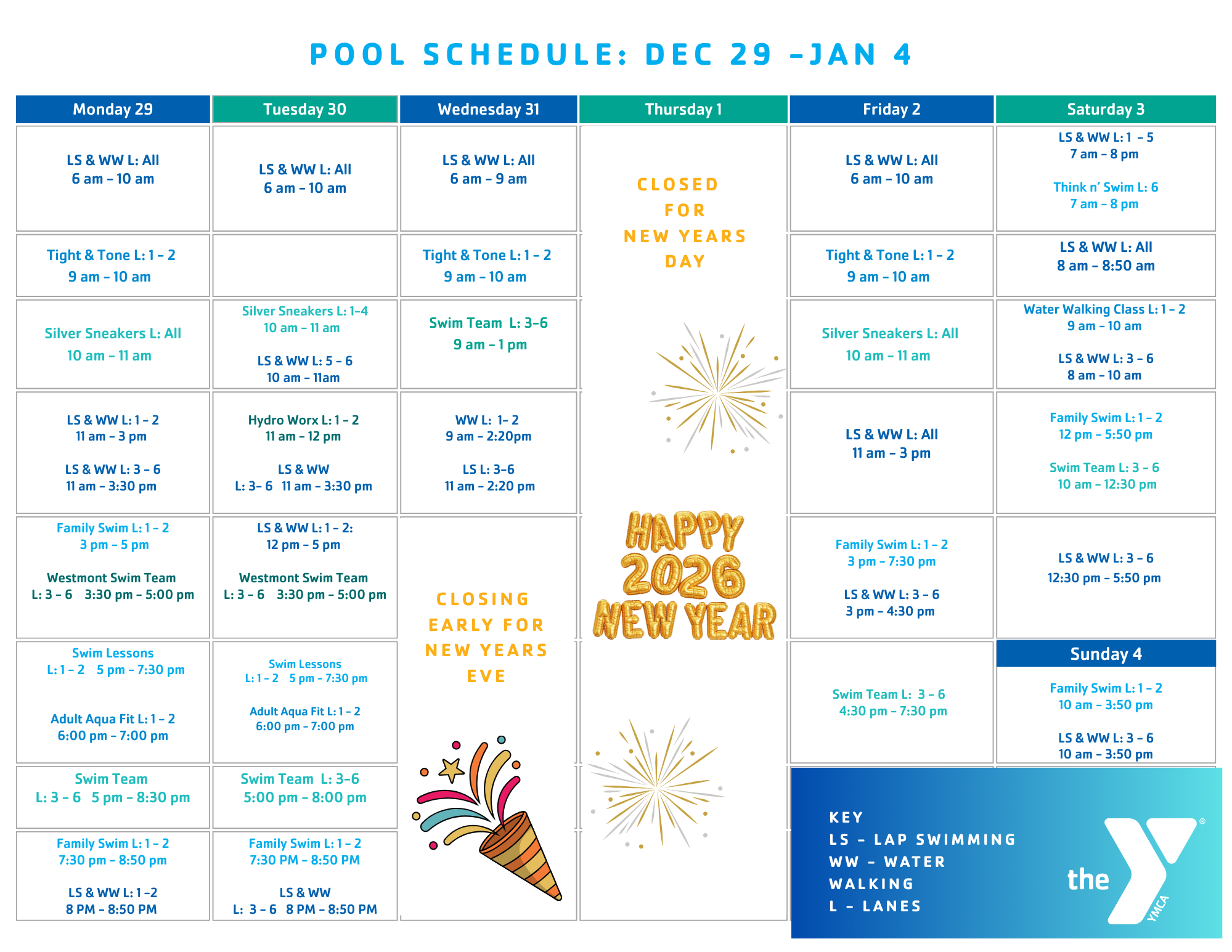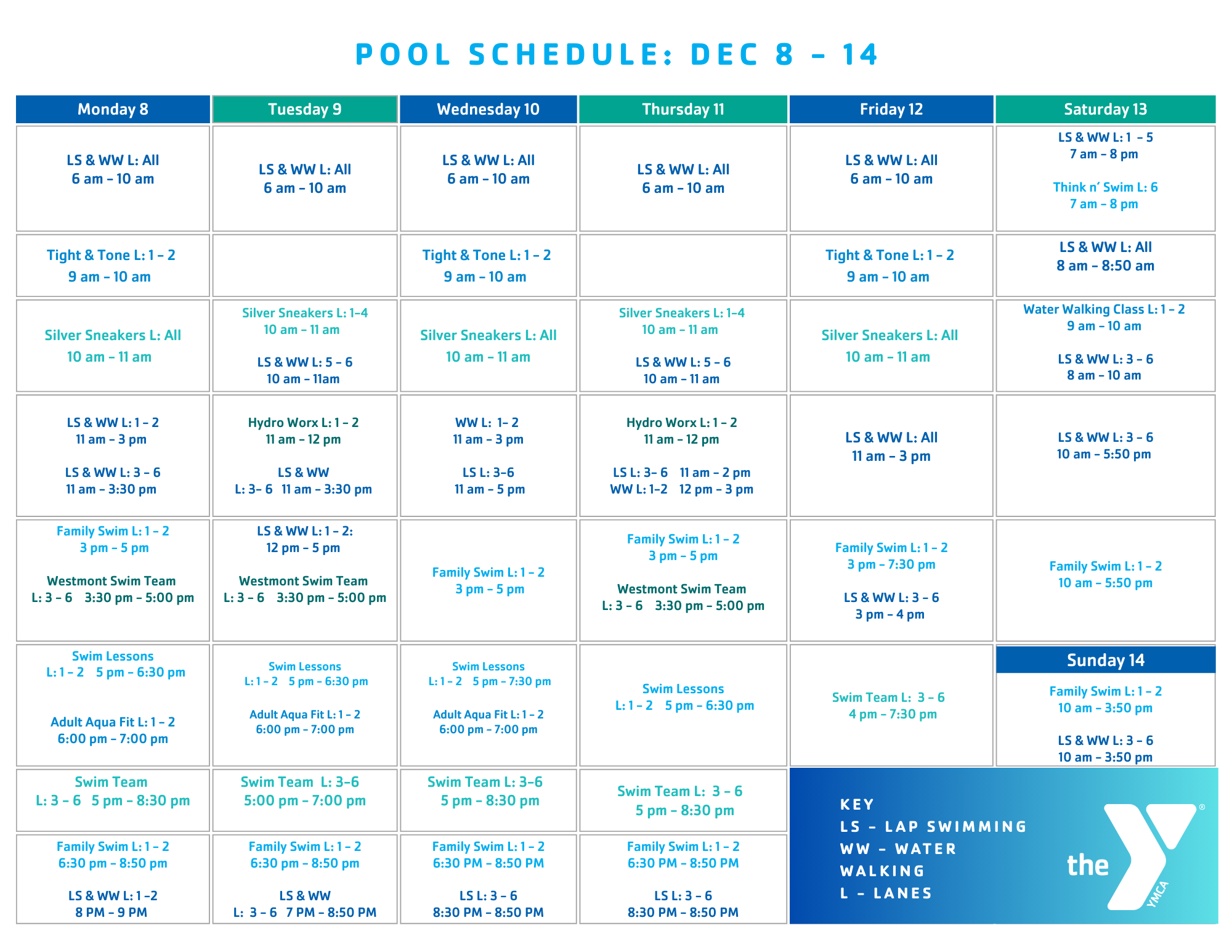 The pool will not open until 8 a.m. on Tuesday, Jan. 16!
